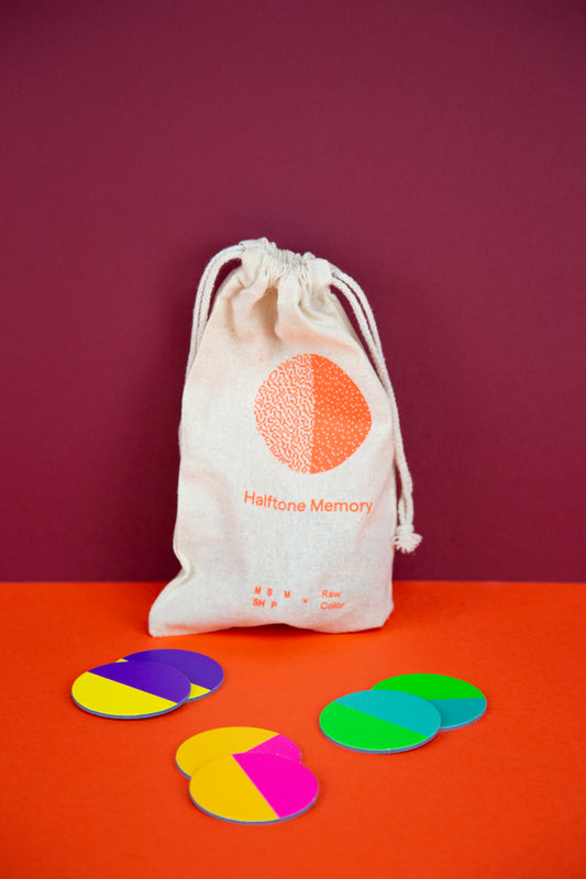 "Halftone Memory is an exploration into colour pairing and offset printing. Each round card combines two tones. It challenges the way we perceive colours. Did I just see a deep green with a saturated pink or was it a bright green and with a muted pink?"